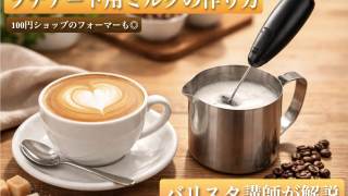 100円ショップのミルクフォーマーでラテアート用フォームミルクを作る方法をバリスタ講師が解説。横回転の作り方や泡の入れ方、失敗の原因と改善方法まで初心者でも分かりやすく紹介します。