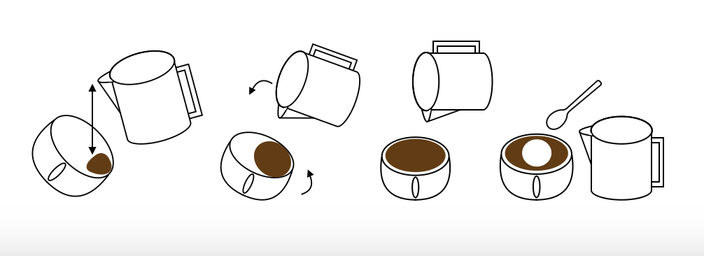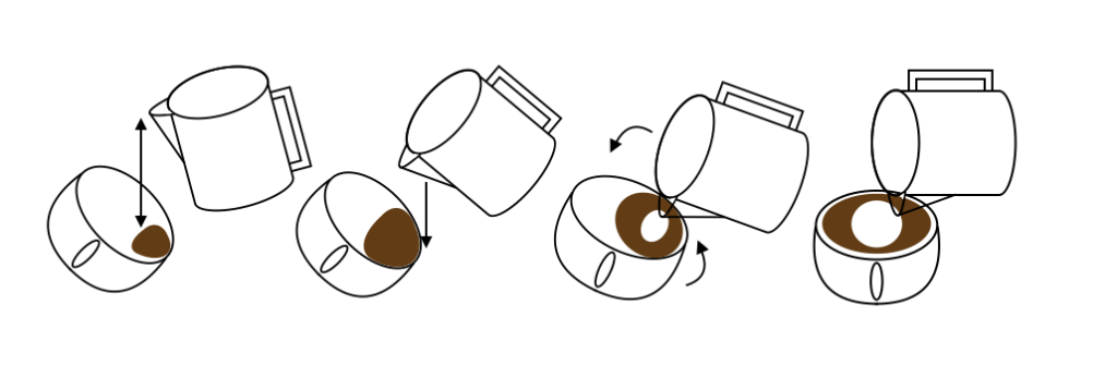 - ピッチャーをカップにつけて注ぎながらカップを平らにする